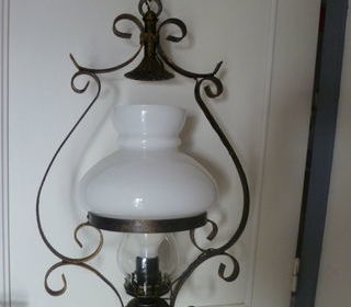 lustre à suspendre, armature fer bronzé façonné, chapeau en verre blanc type opaline: protège-lampe en verre (façon ancienne lampe à pétrole). dimensions: h=70cm, l=40cm, chapeau d