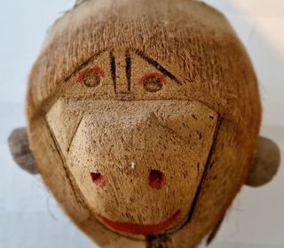 Noix de coco sculptée en tête de singe à suspendre. Ronde 20 cm. Art populaire originaire de Polynésie française de Tahiti des années 70, de manufacture artisanale fait main