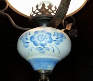 plafonnier en opaline et ceramique decor fleur bleu et avec fer forge tres bonne état
