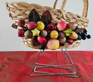 Vends présentoir à bouteille en osier avec poignées, garni de fruits décoratifs réalistes et colorés. Idéal pour la décoration intérieure ou comme centre de table élégant. Notez