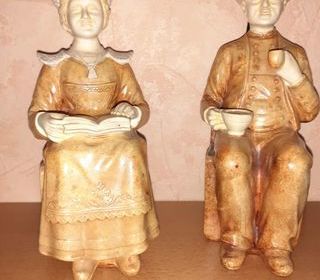 Vends Couple de Bretons ANGELO BIAGIONI Sculpteur à Tours En terre polychrome figurant un couple assis en costume régional Plâtre patiné Hauteur : 22cm ? Largeur : 10cm ? Prof