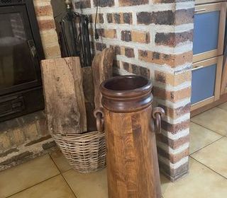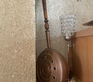 Bassinoire décorative en cuivre, manche bois, motif : hermine.