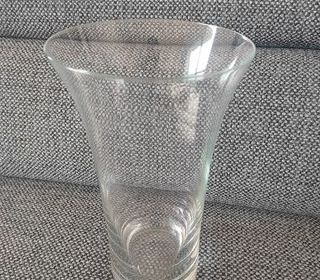 Vase en verre transparent de forme évasée, posé sur un canapé gris. L'objet est sans motifs particuliers et semble être en bon état. M (40) Vase en verre transparent évasé Haute