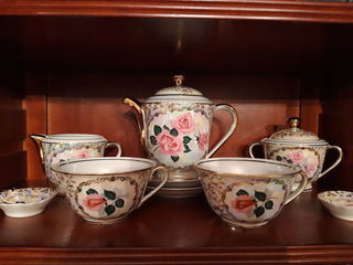 Magnifique service à thé et à desserts, en porcelaine fine Véritable Colombia, décor floral rose des Années 1950 2 tasses, 2 soucoupes 1 sucrier, 1 théière, 1 pot à lait 2