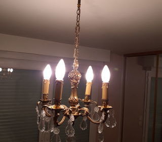 Magnifique lustre 4 branches, à pampilles et bronze doré de style Louis XV Hauteur totale 72cm Largeur 38cm Parfait état