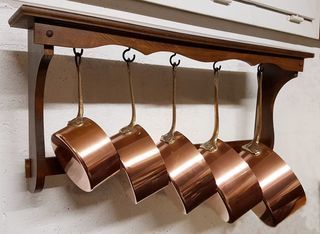 Très bon état - série de 5 casseroles en cuivre alimentaire étamé avec son support. Fabrication française (Métaux ouvrés Vesoul) Années 1975-80 Diamètre Poids 12 375 14 46