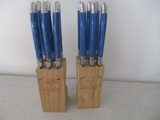 Douze couteaux LAGUIOLE France, trempé z40c13, longueur 24cm, longueur de la lame 11cm, manche couleur bleu, dans un support en bois signé véritable LAGUIOLE Thierry, France par un