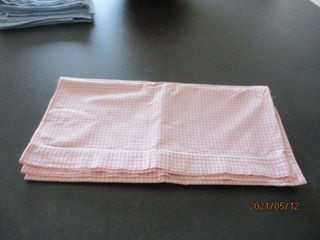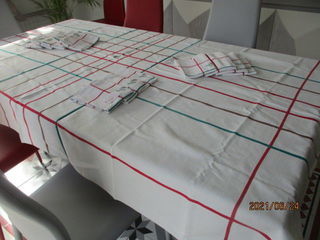 Service de table, tissus très ancien, nappe dimensions 2m20/1m40, couleur blanc cassé et des rayures vertes et rouges 12 serviettes dimensions 47/42cm Le tout avec des initiales