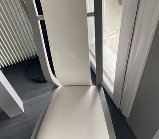6 chaises de salle à manger de marque Monsieur Meuble Cuir blanc. Structure couleur blanche et grises. Cuir un peu abîmé sur certaines mais bonne assise et état général