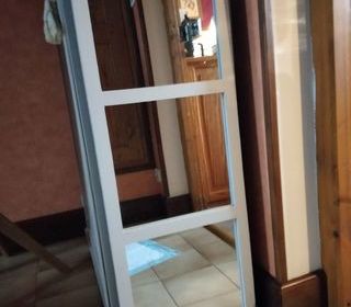 Horizontal ou vertical. Le cadre est en pin, recouvert d'un peinture Dulux Valentine ; satin gris orage. Les miroirs sont fixés par crochet, donc démontables. Hauteur 93 cm La