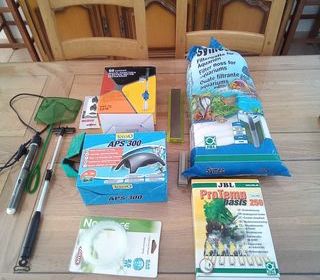 aquarium + accessoires ( pompe, aspirateur, épuisette, pompe a air, chauffage au sol, chauffage,filtration )