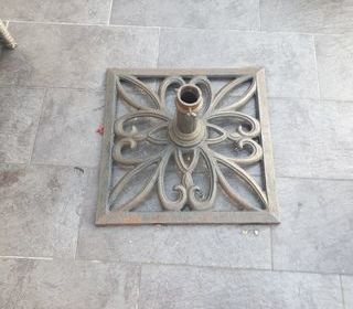 VENDS PIED DE PARASOL EN FONTE HAUTEUR 31CM DIAMETRE OUVERTURE 5.3CM VIS DE SERRAGE POSSIBILITE LIVRAISON carre au sol 58cm