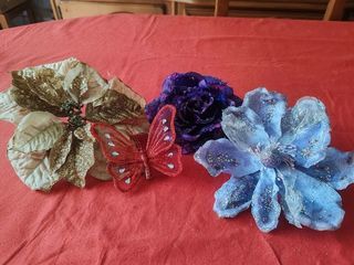 3 fleurs et un papillon avec pince La fleur couleur lilas n'a pas de pince Décoration pour sapin ou autre Lot 6€. Peut être vendu séparément