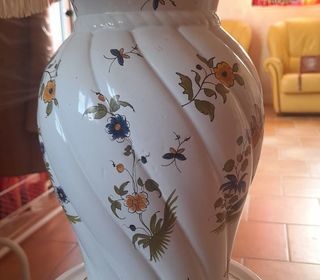 Lampadaire et son abat-jour en faïence décoration Moustiers en très bon état.