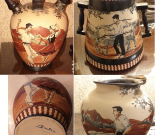 A vendre : Poterie d'art de Ciboure en grès émaillé Décorateur : Rodolphe Fischer Pot Basque décor couple de berger - prix : 80€ Ferrata décor paysan basque - prix : 80€ Garg