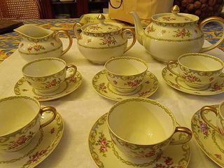 Service à thé porcelaine : ? 1 théière ? 1 sucrier avec couvercle ? 1 crémier ? 6 tasses ? 6 soucoupes Manufacture L. DÉPONDT & WATTEAU, 1900/1930. Décor ? roses, filets or,