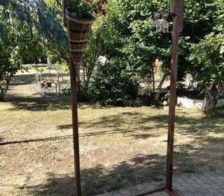 Produite en bois ; c'est du sapin. Les sections sont en demi-chevron ( 60 x 35 mm). L'arche est traitée et poncée. Elle est bien sûr démontable mais pas livrable. Il est possible