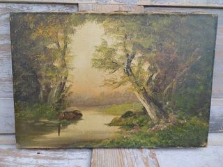 Tableau Huile sur Toile Barbizon Paysage Bois et Rivière non Signé Huile sur toile 35,5cm x 24cm État : Bon état de la peinture (un petit trou de vrillette). Quelques trous