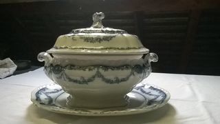 vaisselle anglaise : 2 plats rond diam 34 , une soupière et son plat ovale ('des égrenures) long 36 haut 23 environ (la soupière) ; il y a aussi 8 assiettes mais fusée jaunie ; mer