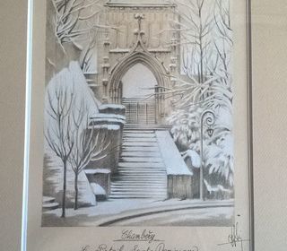 peinture du portail st dominique a chambery de jean jacques simon , mine de plomb sur papier coloré rehaussé de gouache et de craie blanche , format 19 x 28 , cadre 35x45 ; années