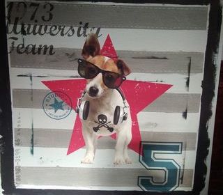 À vendre cadre déco toile motif chien sur fond gris et rouge. Dimensions 60 cm *60 cm.