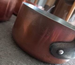 5 casseroles en cuivre et fonte signé :les metaux ouvrés made in france. en assez bon état