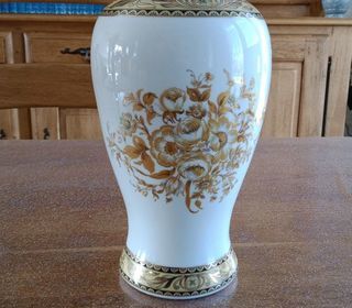 Vase avec couvercle en faïence . Blanc avec décor floral devant et derrière . Liserés dorés avec décor feuilles . Fait main le 20/06/2005 ( daté en dessous / voir photo ) . Hauteur