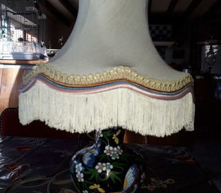 lampe avec abat jour beige avec liseret et franges pied en ceramique noir fleuri