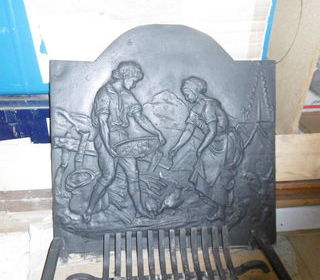 cause installation d'un insert, vend Belle PLAQUE DE CHEMINEE, avec chenets