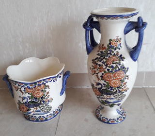 Articles réalisé par la faïencerie de Gien, motif style pivoines, paon couleur de bleu cruche et cache-pot assortis entièrement peints à la main selon des techniques exclusives. Cu
