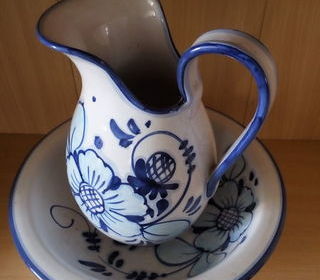 TRÈS JOLIS BROC ET VASQUE DE TOILETTE Vasque 24 circonférence Broc H 20 Cm faïence émaillé blanc d'un bleu rois et fleur pastel , aucun défaut Fêlure, écailler ou éb