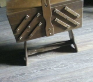 VEND TRAVAILLEUSE BOIS VINTAGE BON ETAT. ELLE EST REMPLIE D'ACCESSOIRES: RUBANS - ELASTIQUES - AIGUILLES - FIL - CISEAUX - ECT.