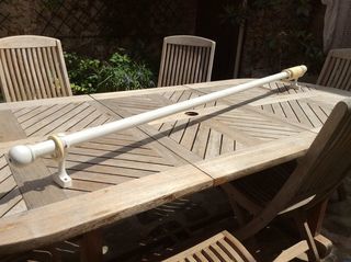 vends tringle à rideaux en bois, peinte en blanc, avec support en bois. Dimension: 1,75 m 16 anneaux