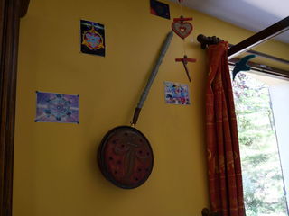 Le manche est en bois peint. Le "contenant", en cuivre, représente une fleur de lys.