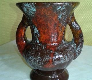 A vendre petit vase avec anses sur le côté non signé mais attribué Vallauris marron flammé rouge en parfait état années 50/60. Provenance famille. Hauteur : 14cms. Diamètre du co