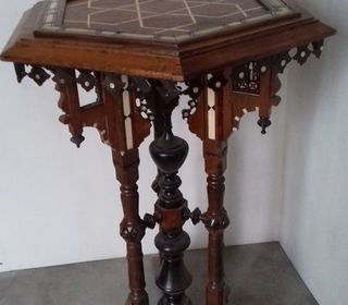 guéridon orientaliste dans le gout de ''CARLOS BUGATTI'' en noyer et marqueterie de bois précieux en très bon état sa hauteur 72cm le plateau fait 47 cm entre chaque face pour p