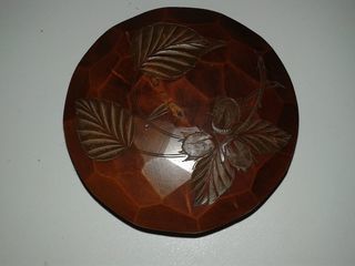 a vendre ancienne boite avec couvercle en bois. Motif feuille de noisetier . Elle date des années 60. joli travail de bois avec des bords à pans coupés. Dimensions: Hauteur : 5