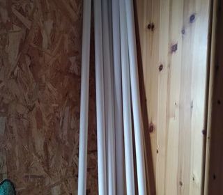 6 tringles blanches de 2 mètres + 1 de 2,50 mètres de long Diamètre 33 mm En bois, blanches. Etat satisfaisant Donné avec : 20 anneaux plastique blanc pour tringle 35 mm, 30 an