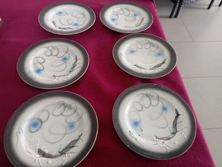6 assiettes dont une légèrement ébréchée - 6 tasses - la théiére - le pot à lait et le sucrier
