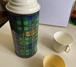 Tres grosse baisse.Pièce RARE, pour les collectionneurs, ou à utiliser. TERMOS Anglais Décor bleu et vert bordé de doré, hauteur 27 cm diamètre 11 cm. Avec 2 gobelets ce qui n'exi