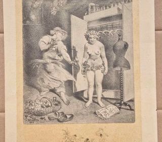 L'avarice, un des 7 péchés capitaux : représentation d'une bacchante, seins nus, vêtue de feuilles de vignes sur les hanches, peu encline à l'essayage la nouvelle collection de mod