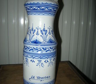 vase 2 orifices motif bleu. Inscription en bas: La Trinidad. Origine Espagne