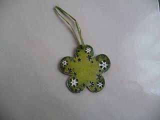 Fleur en bois pour décoration, différents tons de verts, petites fleurs peintes en blanc, morceau de raphia pour l'accrocher où vous voulez (exemple : poignée de porte ou de meuble
