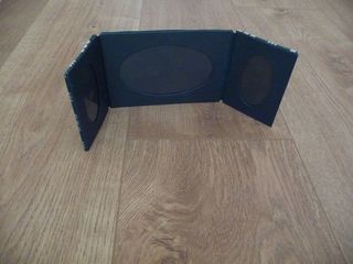 Cadre photo en tissu légèrement matelassé vert et blanc, permet de mettre 3 photos, cadre pliable en 3 volets, se pose sur un meuble. S'emporte partout en voyage. Vos photos préfér