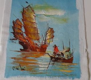 A vendre toile peinture à l'huile format 34 cms de haut par 28 cms de large représentant un magnifique bateau à voiles et un petit bateau au premier plan. Le fond est bleu le gran