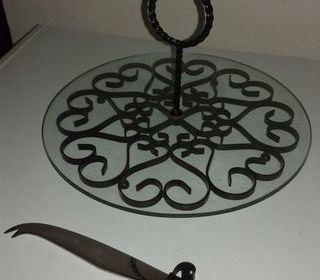 Magnifique plateau à fromages avec couteau vintage en métal noir plateau de verre diamètre 28 cms. Couteau de service avec manche en métal torsadé. Il est en parfait état et date