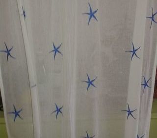 A vendre un rideau blanc coton avec des étoiles de mer brodées bleues. Il est à l'état neuf. Largeur : 1m25. Hauteur : 1m85. Passage pour une tringle plate. Ourlet fait en bas