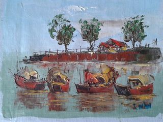 A vendre une toile peinture à l'huile représentant 4 jonques sur fond de village avec des arbres. Travail asiatique ramené d'un voyage. Hauteur : 29.5cms. longueur : 34 cms; Pr
