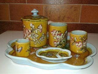 Service fumeur en barbotine de 6 pièces comprenant : - 1 plateau de longueur 30 cms X largeur 24.6 cms. - 1 Pot avec couvercle de 9.5 cms de haut X diamètre ext 9.3 cms. - 1 Po