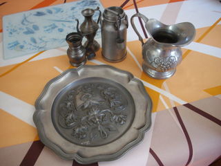 Vends etains divers en bon etat (vide campagne)/assiette 22 cm diametre,pot a lait 11 cm haut,pot verseur 11 cm,2 petits cruchons 7 et 10 de haut AUCUN ENVOI 12 EUROS PIECE